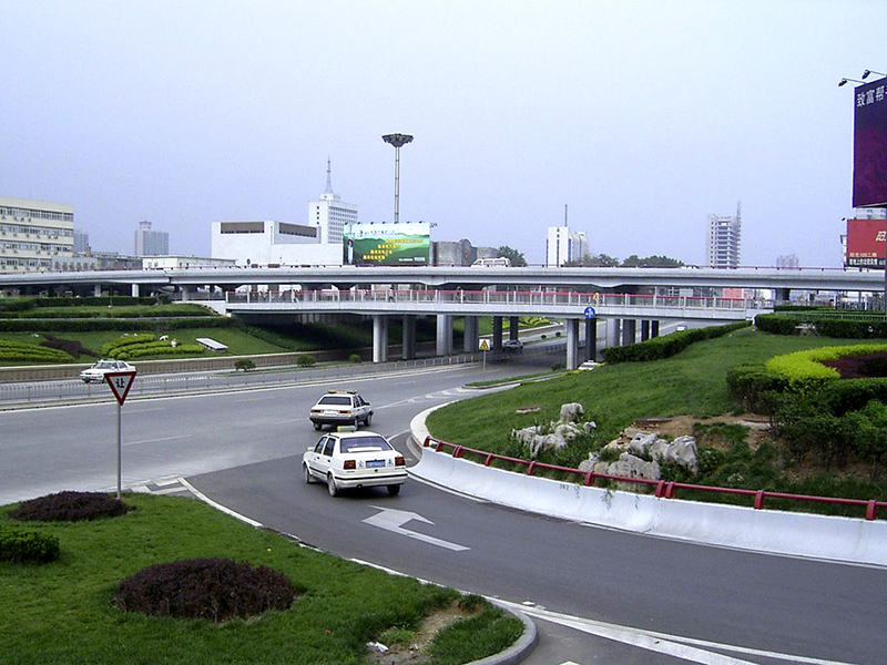 為苜蓿葉形三層互通式立交,兩條主干路均寬 50 米,橋梁上部采用簡支箱梁,寬腹 T 梁及三孔連續(xù)板結構,預制安裝,施工簡單;下部蓋梁為暗藏式,墩身采用蝙蝠式柱,外形美觀;基礎為鋼筋砼擴大基礎及灌注樁;該立交充分利用原有排水系統(tǒng),雨污水完全自流,經(jīng)濟合理。榮獲市長金杯獎,被評為泉城十大景觀之首。